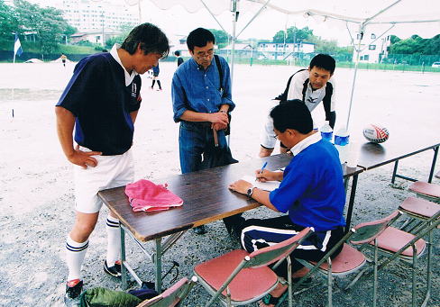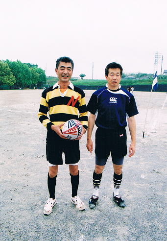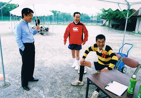 土谷先輩(2回生)が着ておられる黄黒のジャージは当時のもの。 約35年前の貴重な逸品です。本日の為に、苦労して探されたとの事。 試合の後、現役チームに寄贈されました。 現役諸君、永久保存として、大切にして下さい。