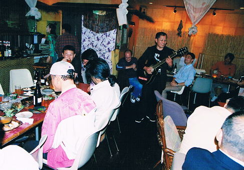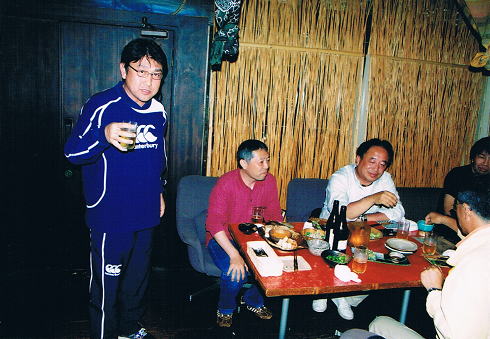 夜になってラグビーウェアに着替えられた水野会長の挨拶で、 親睦会がスタート。